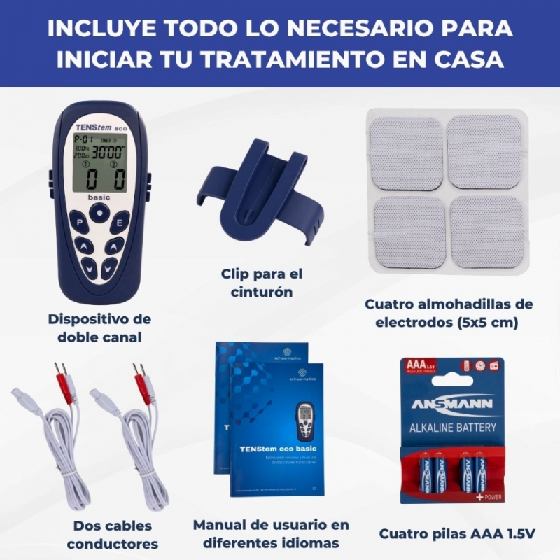 Los programas en sí son muy versátiles, pudiendo usar fácilmente los predefinidos o hacer sus propios ajustes. El TENS Eco Basic permite tratamientos de alta frecuencia y de baja frecuencia y la estimulación dinámica. Así como estimulación con pulsos de corriente puramente positivos (monofásicos). Además, la iontoforesis y los bloqueos nerviosos también son posibles. Esto hace que el práctico dispositivo TENS sea la elección correcta tanto para los pacientes como para los profesionales médicos.