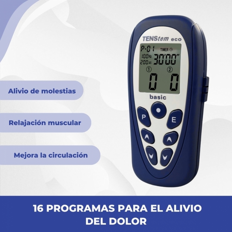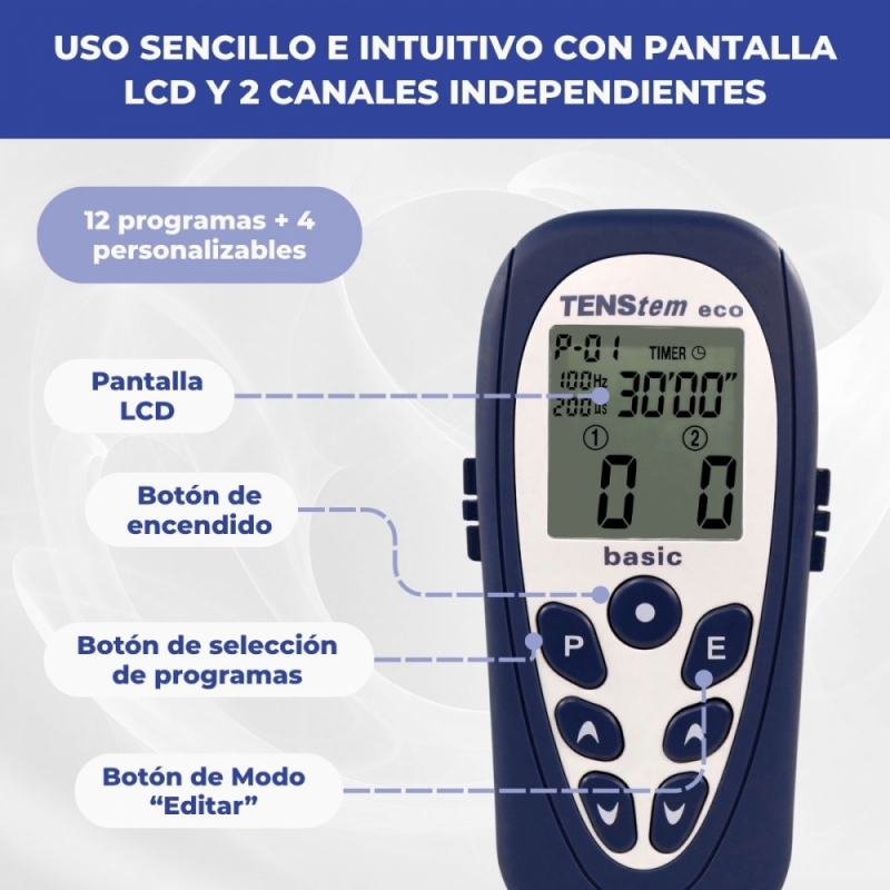 TENS Eco Basic ofrece una gran diversidad de programas, incluye 12 programas preestablecidos tales como ráfaga, modulación de frecuencia, estimulación muscular, estimulación dinámica o estimulación HAN. También ofrece 4 programas gratuitos para configuraciones propias.
