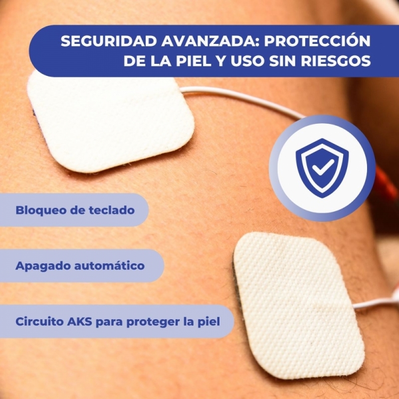 El circuito de salida integrado (AKS) reduce el riesgo de irritación de la piel, por lo que con este dispositivo TENS también es posible el uso a largo plazo.