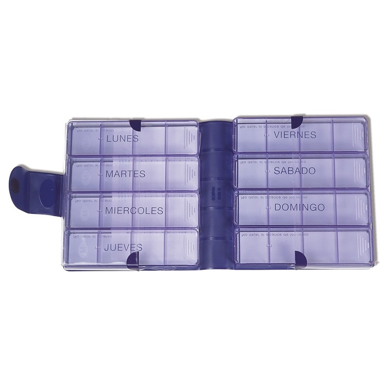 Además, está compuesto de 7 pastilleros diarios extraíbles correspondientes a cada día de la semana. Cada uno de los pastilleros diarios tiene 4 tomas. Los pastilleros diarios están marcados con el día de la semana correspondiente. Así mismo, la capacidad aproximada de cada hueco es de 6/8 pastillas de tamaño medio. También incluye sistema de lectura en braille.