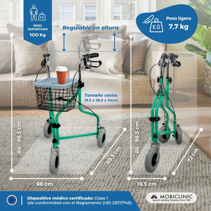 Andador para ancianos | Plegable | Freno en manetas | 3 ruedas | Cesta | Verde | Caleta | Mobiclinic