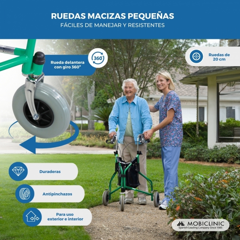 SU SEGURIDAD, LO MÁS IMPORTANTE: Sus tres ruedas macizas y sus frenos en las empuñaduras hacen que este andador con ruedas sea muy seguro para el usuario