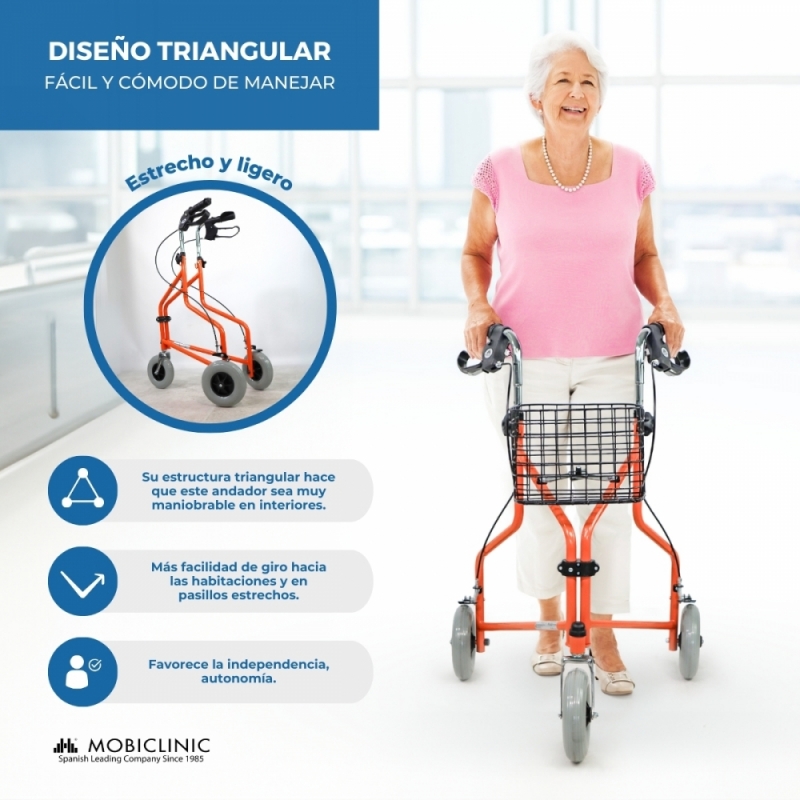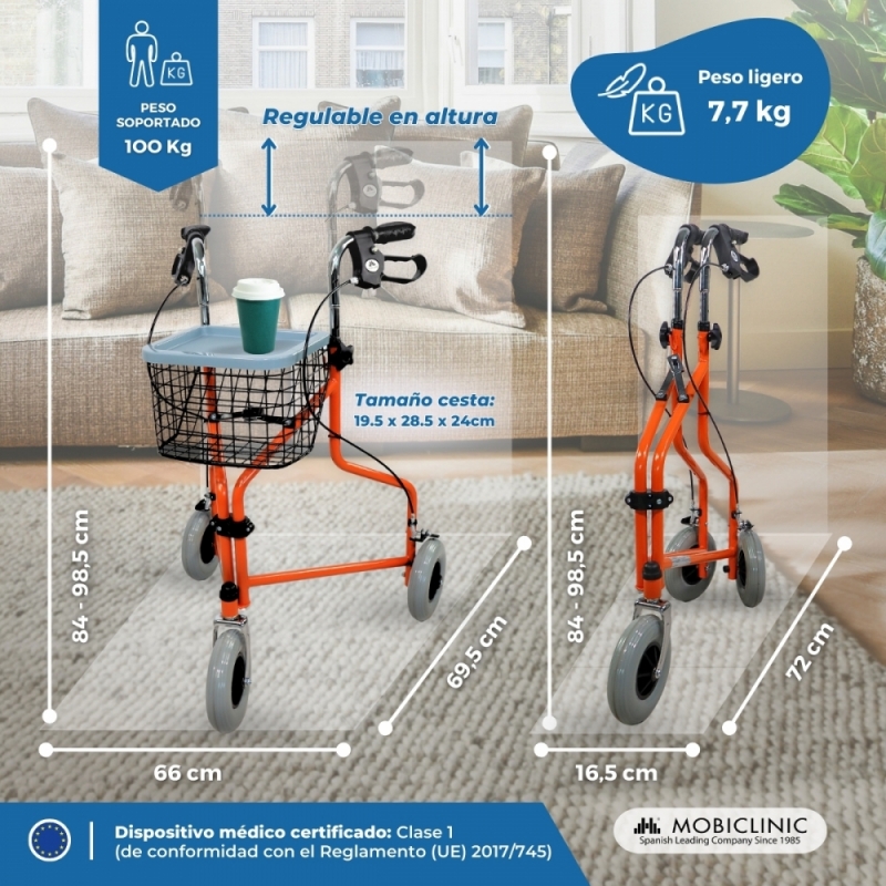 Andador plegable | Freno en manetas | 3 ruedas | Cesta | Naranja | Caleta | Mobiclinic