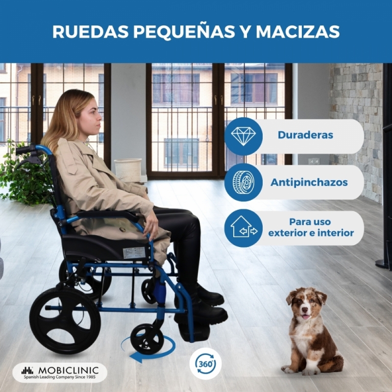 Por otro lado, sus ruedas de 15 y 30 cm de diámetro facilitan el trabajo del acompañante ya que le permite realizar largos recorridos sin ninguna complicación.