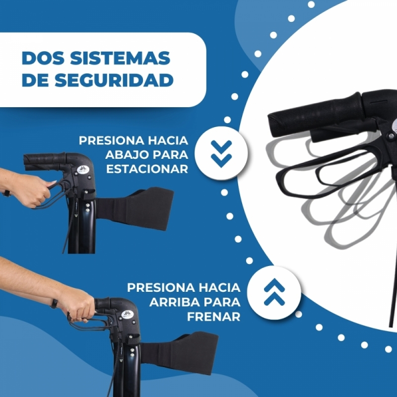 BLOQUEO: Si se necesita inmovilizar por completo el andador, hay que tirar de las manetas de los frenos hacia abajo y las ruedas quedarán bloqueadas. Para desbloquear hay que tirar de las manetas hacia arriba.