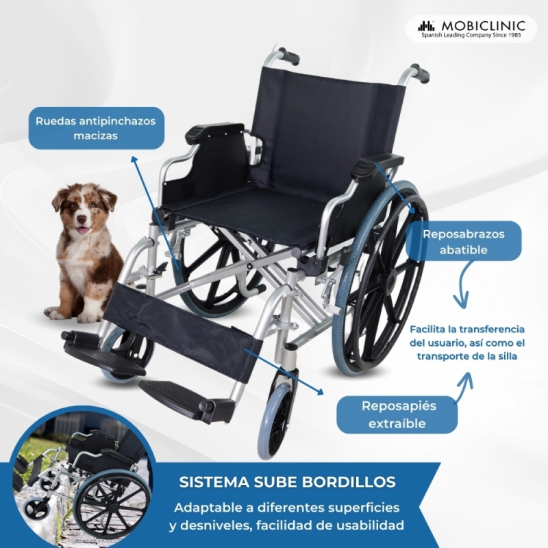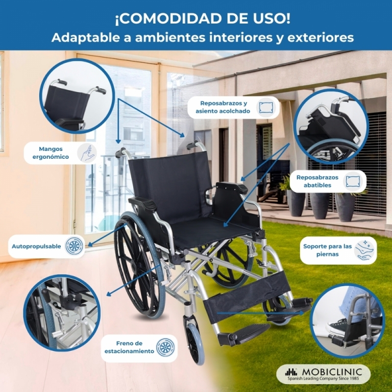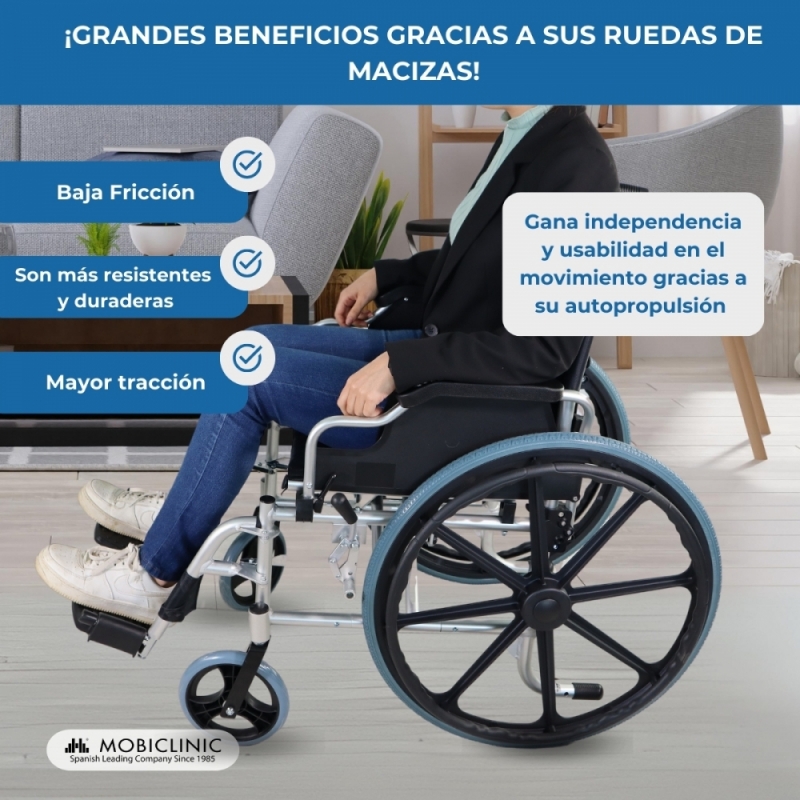 Sus ruedas de 20.5 y 58.5 cm de diámetro facilitan el trabajo del acompañante, ya que le permite realizar largos recorridos sin ninguna complicación, además de tratarse de una silla de ruedas cómoda. Dispone de cuatro ruedas macizas y radios MAG.