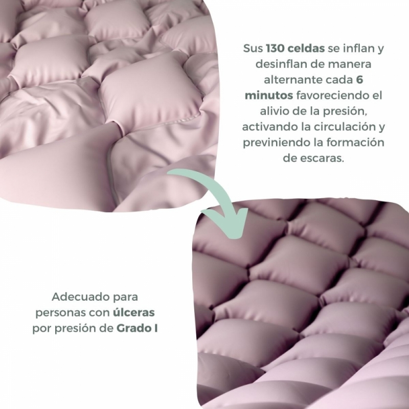Sus 130 celdas individuales, se inflan y se desinflan alternativamente, durante periodos de 6 minutos y de esta manera, el paciente recibirá un constante alivio de la presión. Esta presión que es distribuida sobre la estructura por la alternancia de celdas, activa la circulación y previene la formación de escaras.