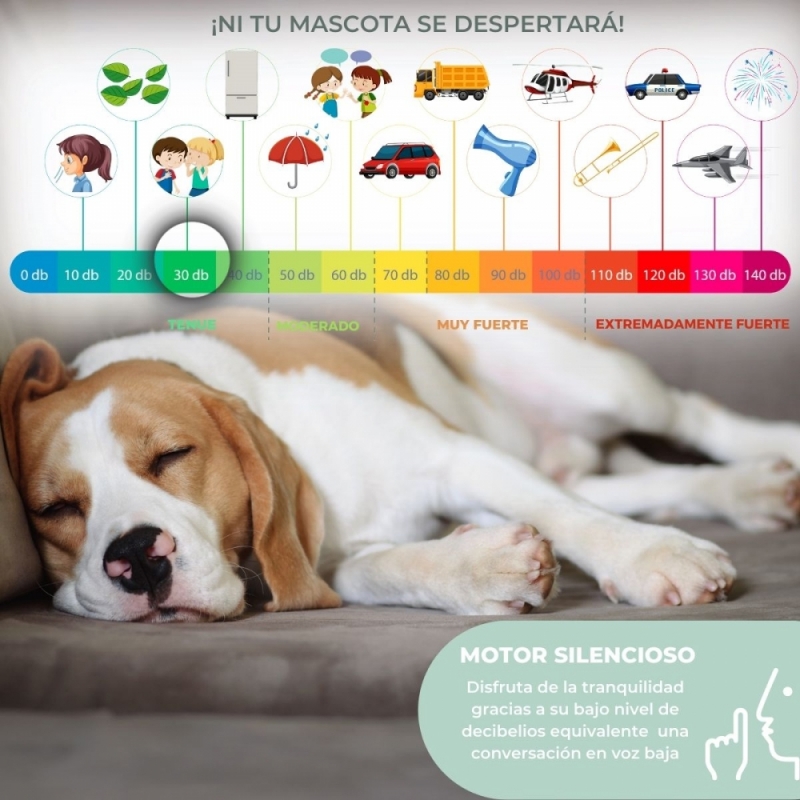 Por otro lado, el compresor del colchón antiescaras es compacto, fiable, fácil de usar y muy silencioso, equivalente a una conversación en voz baja en proporción a los niveles de decibelios respecto a los diferentes tipos de ambientes, un punto que hay que tener en cuenta ya que para su uso debe estar siempre conectado.