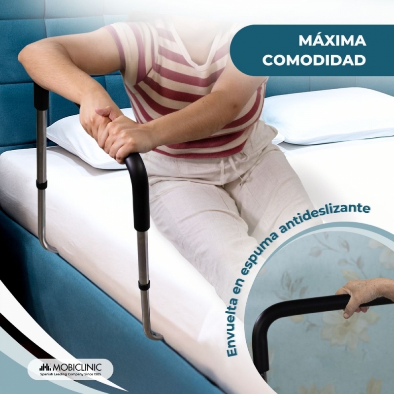 Esta barrera de cama está pensada para garantizar comodidad, autonomía y seguridad a personas con movilidad reducida. Su diseño ergonómico permite un apoyo firme y estable para incorporarse en la cama sin esfuerzos y con mayor autonomía. Su altura es regulable, lo que permite que se adapte a distintos modelos de camas convencionales (individuales, matrimonio o dobles) y a las distintas necesidades del usuario.
