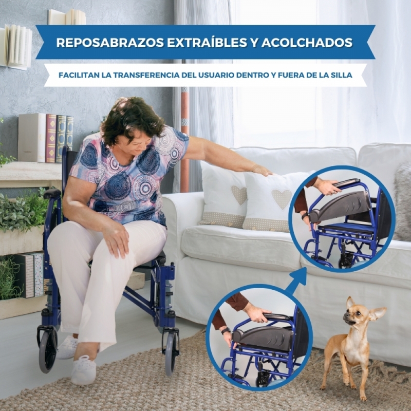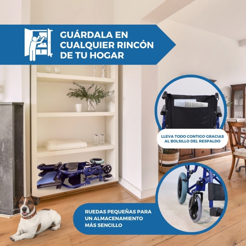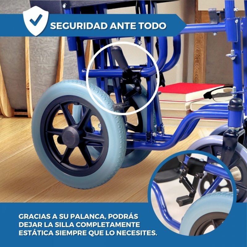 Por otro lado, presenta un fácil sistema de plegado, gracias al cual podrás pasar por lugares estrechos y volver a abrirla rápidamente. Este mecanismo también es útil para ahorrar espacio en casa a la hora de guardarla. Esta silla ortopédica es ideal para aquellas personas que tienen dificultades para caminar o desplazarse, así como para personas que acaban de pasar por una operación o para ancianos.
