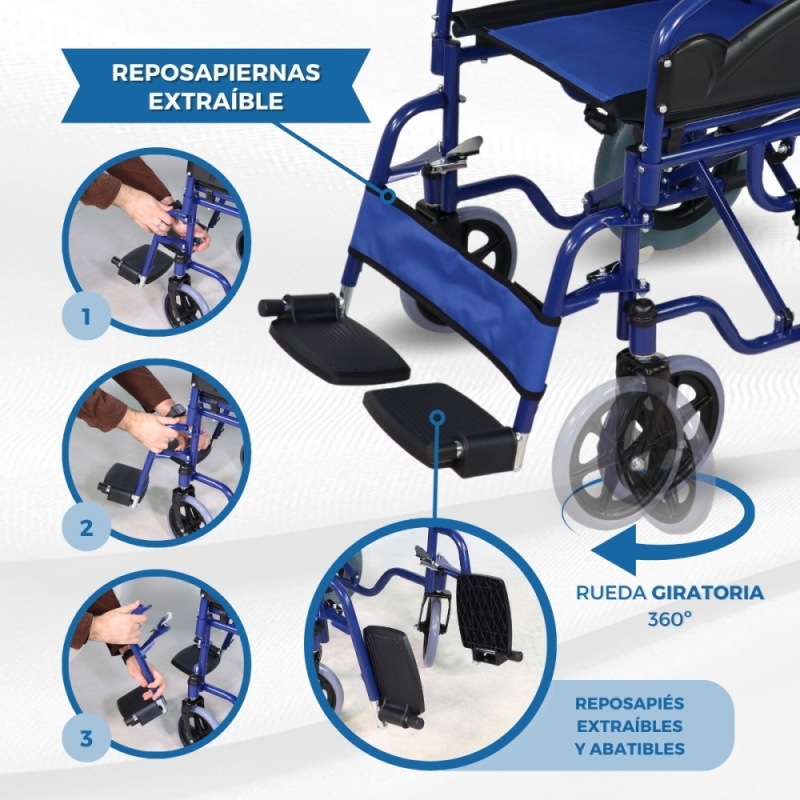 CÓMODA: esta silla de ruedas manual contiene reposapiés desmontables y giratorios, así como reposabrazos abatibles hacia atrás y desmontables.