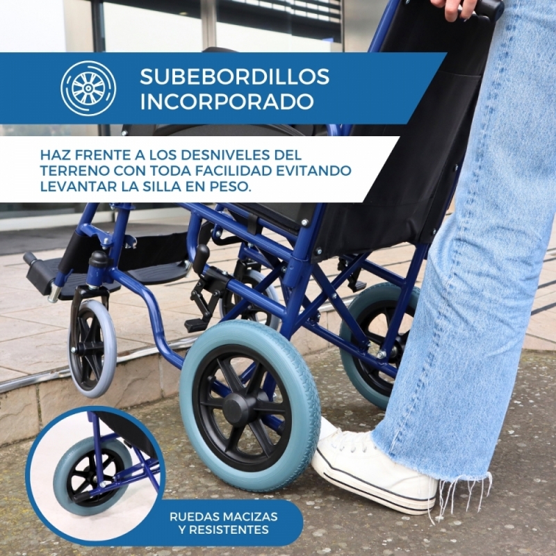 Esta silla de ruedas para personas con movilidad reducida cuenta con una palanca de pie, la cual es de gran ayuda para el acompañante a la hora de subir y bajar pequeños escalones. Esta silla de ruedas de traslado dispone de un juego de ruedas macizas. Gracias a ello, la posibilidad de que se produzca un pinchazo es menor, por lo que se convierten en el producto perfecto para el exterior.