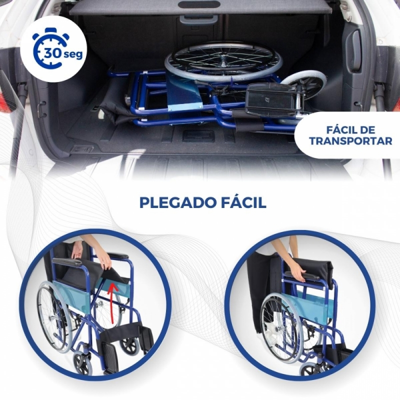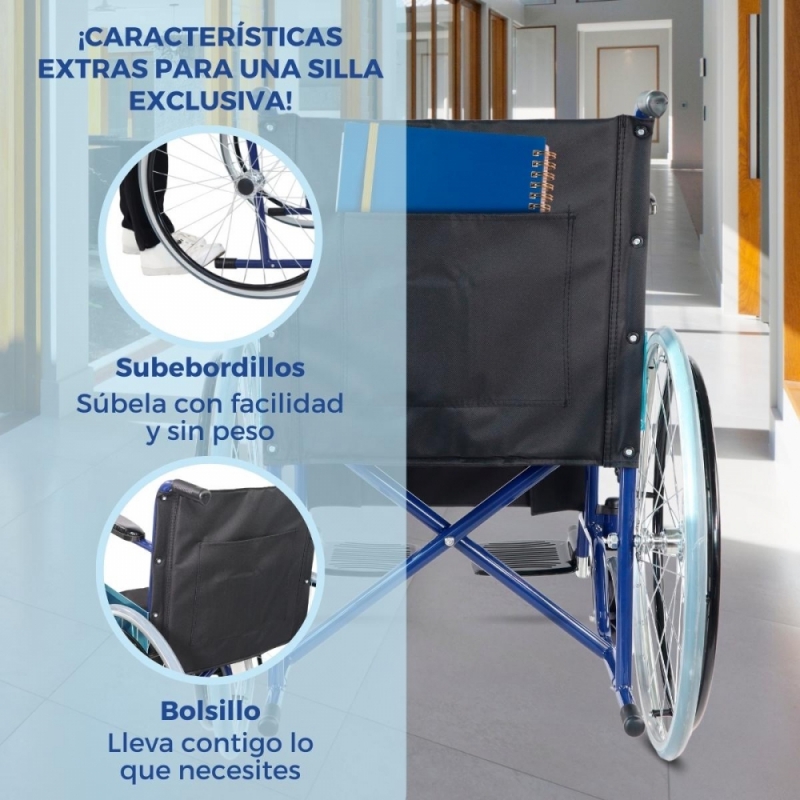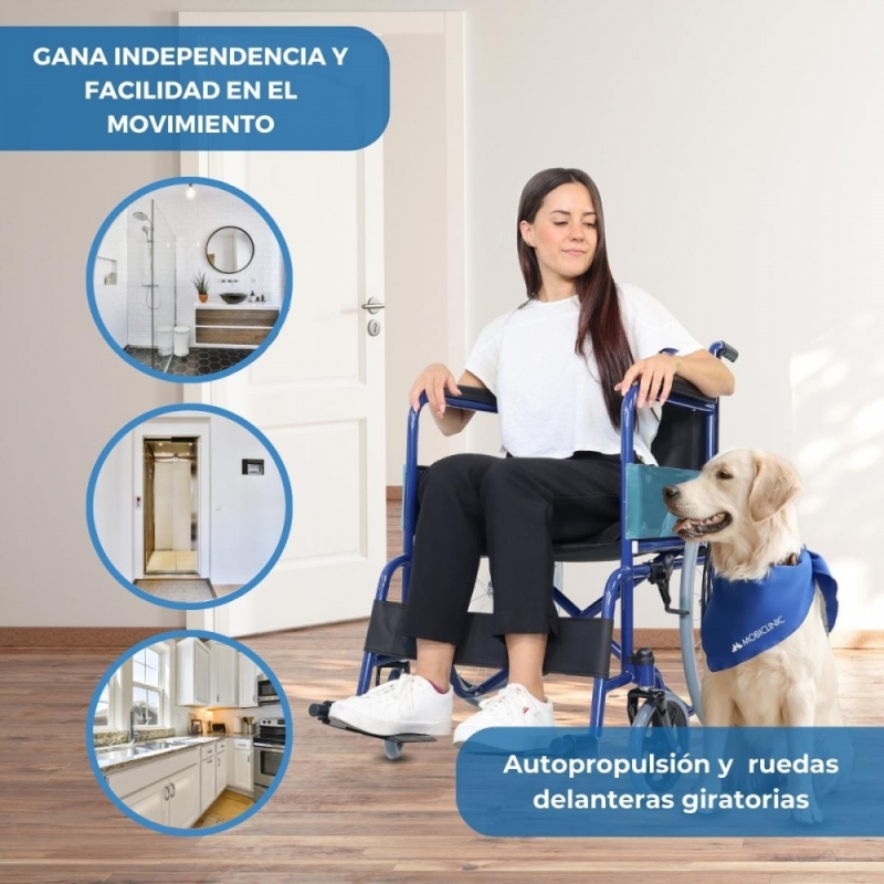 Es una silla de traslado que cuenta con una gran autonomía con ruedas que reducen el esfuerzo y frenos manuales que impiden posibles vuelcos.