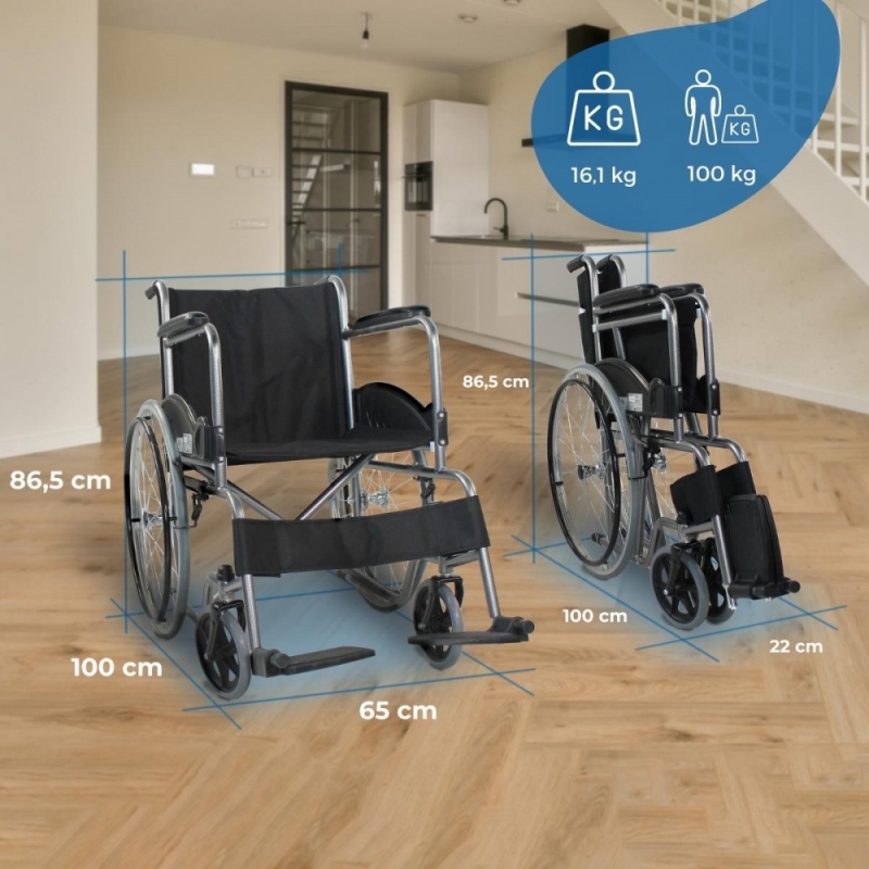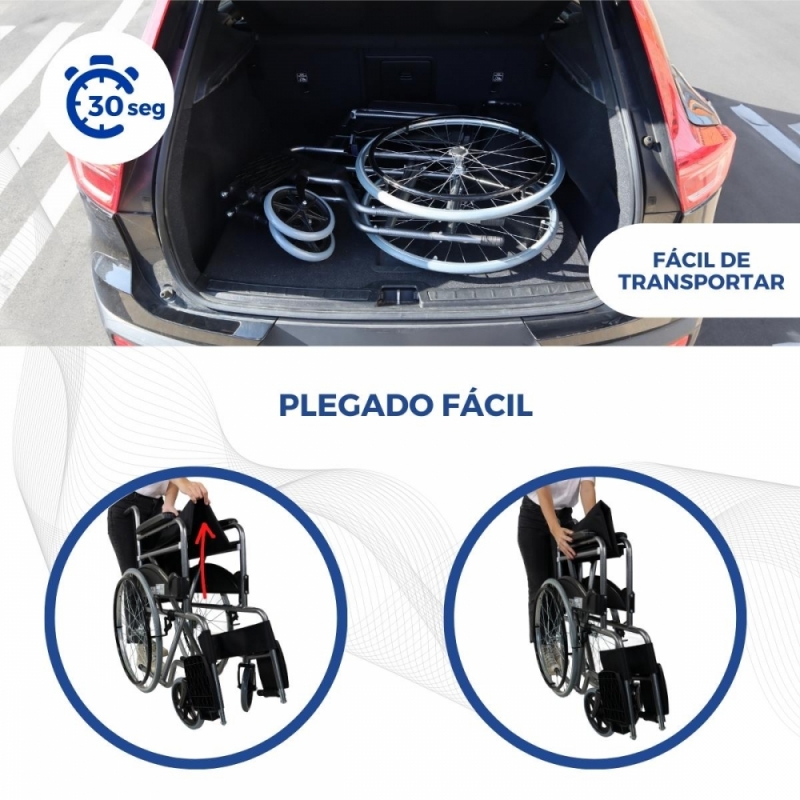 PUERTAS Y MALETERO: Esta silla de ruedas tiene un ancho total de 64 cm, por lo que puede pasar por puertas de ancho estándar de 72.5 cm. Además como esta silla plegada mide sólo 22 cm, se puede transportar en el maletero de un vehículo tipo Ford Focus. Asegúrese de las medidas de sus puertas y vehículo para comprobar que le viene bien.