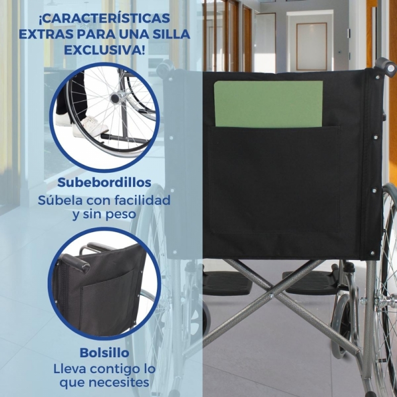 AUTONOMÍA Y SEGURIDAD: silla de ruedas de acero fabricada con material ignífugo, lo que proporciona una mayor protección al cliente y una gran durabilidad.