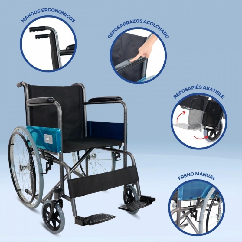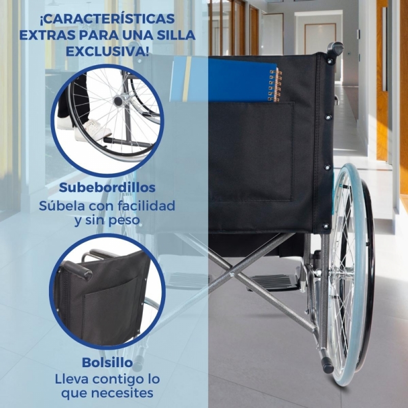 Su asiento y respaldo son ergonómicos, diseñados para aportar el mayor confort posible. El respaldo incluye bolsillo de seguridad para guardar tus pertenencias. Las ruedas son especialmente pensadas para garantizar la seguridad y facilitar la movilidad, exigiendo el mínimo esfuerzo. Es una silla de ruedas económica, que presenta una gran autonomía con ruedas que minimizan el esfuerzo y frenos manuales que evitan posibles vuelcos. Los frenos manuales resultan seguridad garantizada, ya que evitan la puesta en marcha y el vuelco de la silla para discapacitados en condiciones adversas.