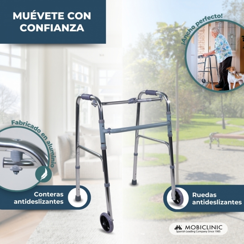 El andador con ruedas para adultos será su mayor aliado, gracias a sus dos ruedas delanteras macizas que le permitirán mayor agilidad y facilidad de movimientos y dos conteras traseras para evitar que el andador se resbale.