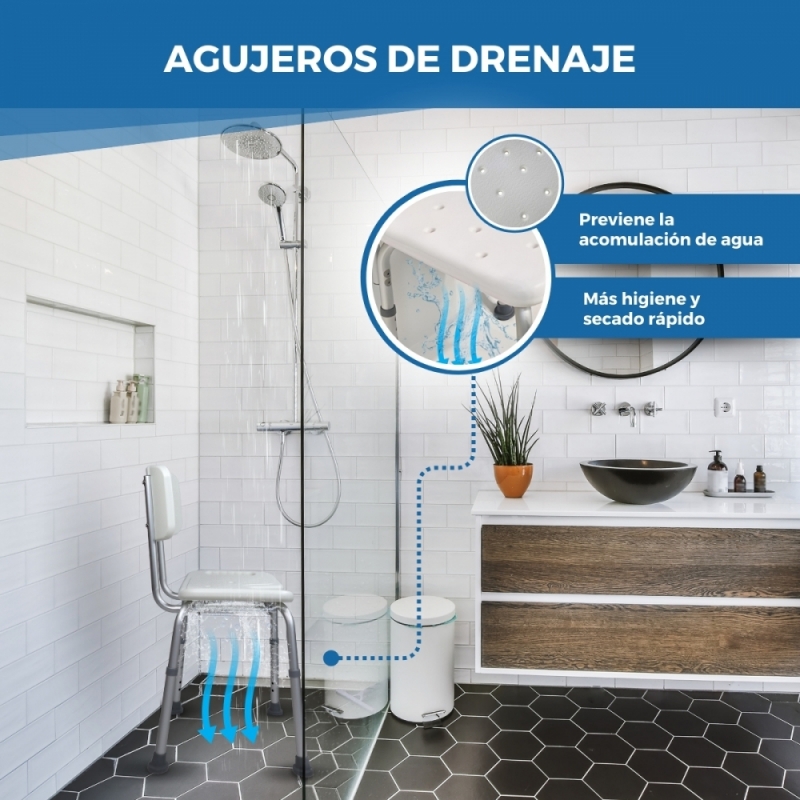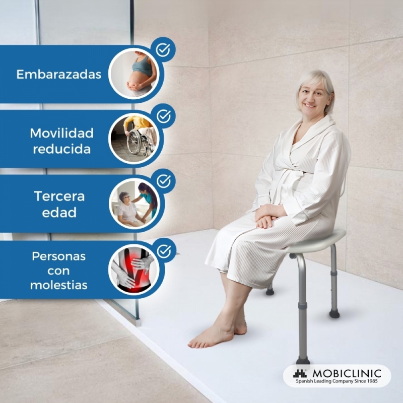Es ideal para utilizarla en tu ducha, bañera o cualquier otra dependencia del baño. El diseño de sus patas y las antideslizantes conteras de caucho con las que cuenta, hacen que se adapte perfectamente a la superficie de apoyo, garantizando así la estabilidad durante su uso.