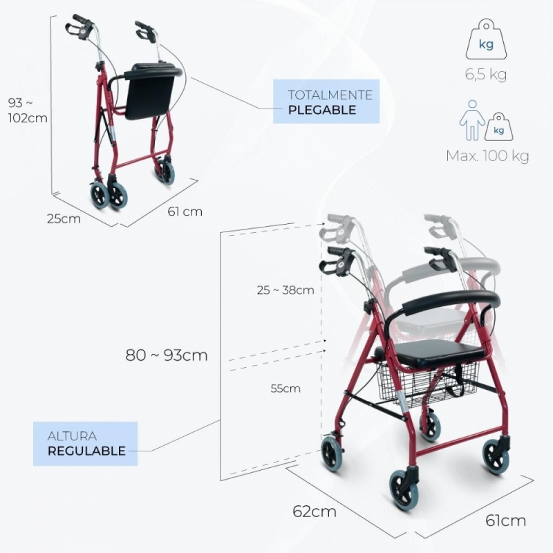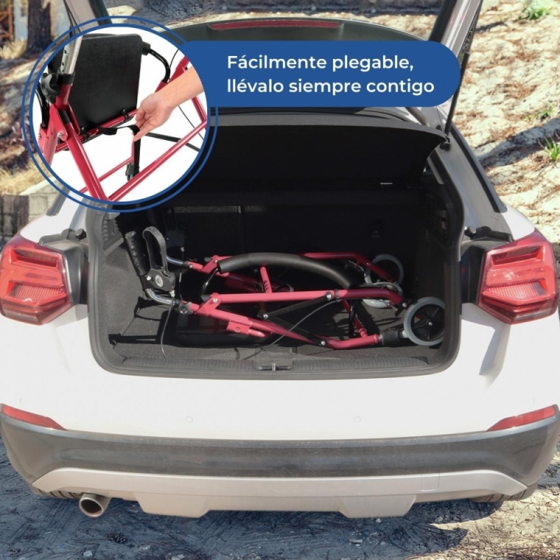 - Respaldo acolchado, permite un descanso completo en tu andador con 4 ruedas, fundamental para reponer fuerzas.