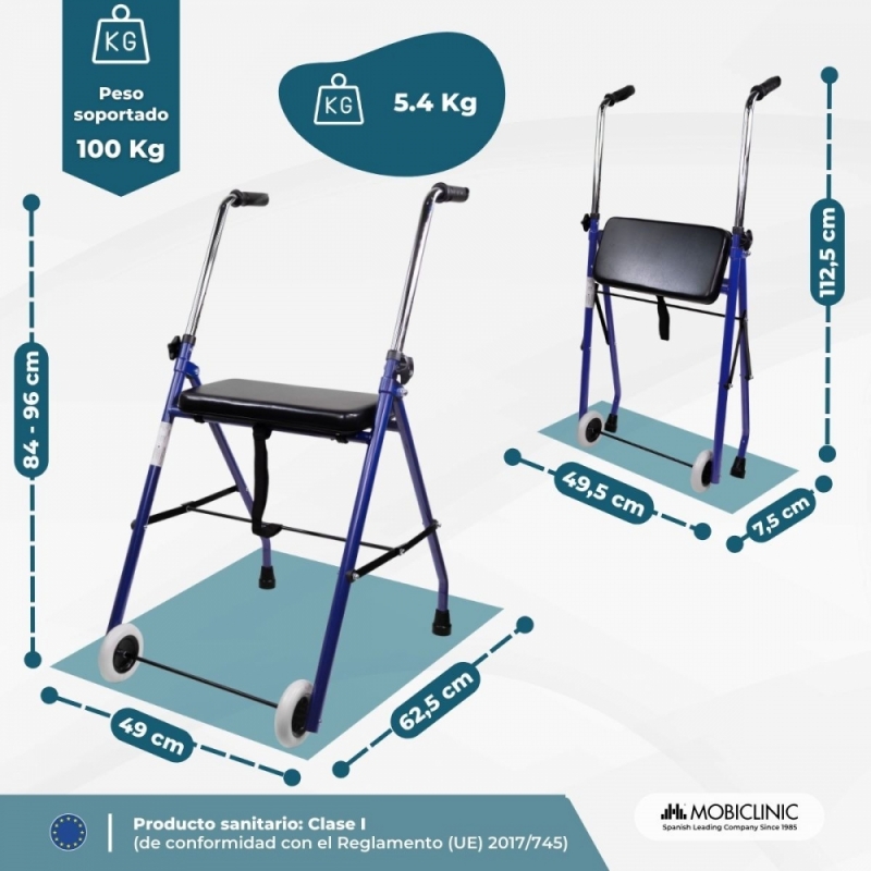 CÓMODO: gracias a sus puños anatómicos y su asiento de PVC acolchado, no solo es un andador ortopédico cómodo para desplazase sino también para descansar.