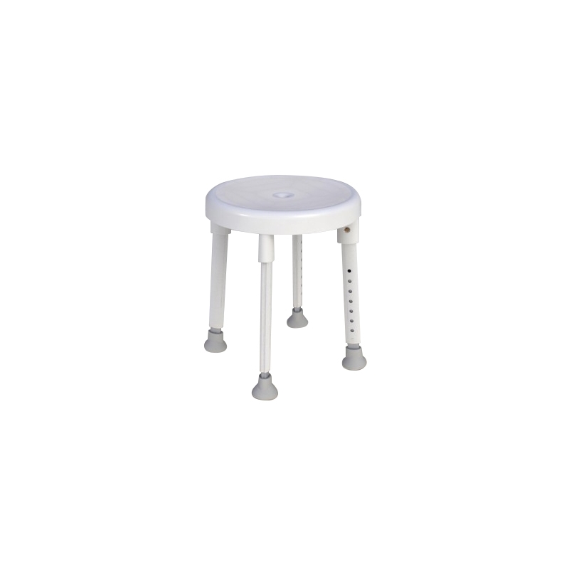 Taburete de ducha redondo fabricado en plástico con patas de aluminio inoxidable regulables en altura.