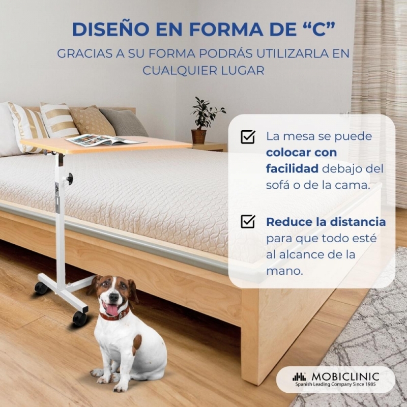 Mesa auxiliar para cama o sofá | Regulable en altura | 38 x 72 x 2 cm | Ligera | Con ruedas | Madera | Meseta | Mobiclinic