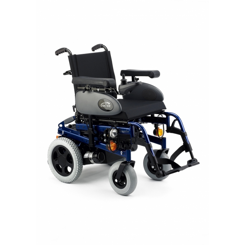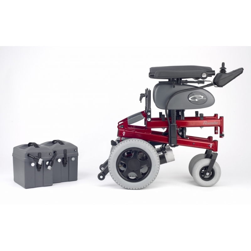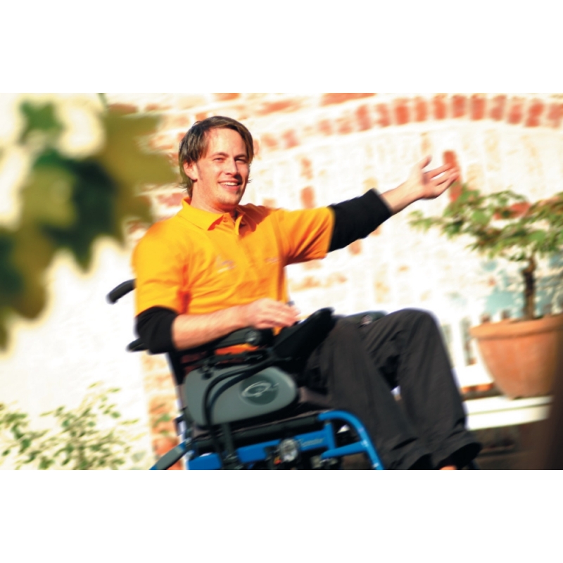 Es una silla de ruedas eléctrica muy versátil, con la que se podrá desplazar cómodamente. Su estructura tubular le aporta gran resistencia y robustez. Esta silla de ruedas presenta un plegado muy compacto, ya que el respaldo se desmonta fácilmente, y las baterías van en dos cajas para facilitar su manipulación. El respaldo se puede regular en altura en tres posiciones quedando la altura correspondiente en 43, 46 y 49 cm. Además permite ajustar el ángulo del respaldo entre 0º y 30º. Consultar otro colores del chasis (disponible en: rojo brillante, gris plata, negro brillante y azul brillante). Las ruedas traseras son neumáticas y las delanteras macizas. En ortopedia siempre se busca dar un paso más y con esta silla de ruedas se intenta afinar más en las necesidades de los usuarios.