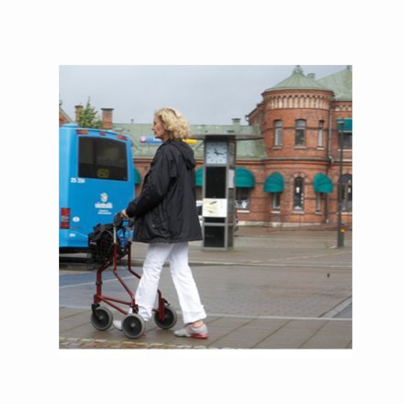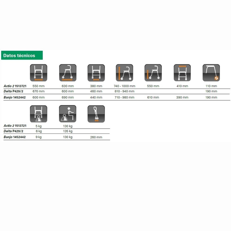 Puños ergonómicos regulables en altura: 81 - 94 cm Sistema de fácil plegado 3 ruedas de diámetro de 200 mm Anchura: 670 mm Longitud de rueda trasera a delantera: 600 mm Peso del andador: 6 kg Peso máximo soportado: 135 kg