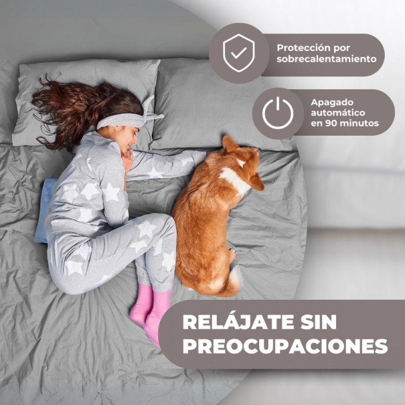 APAGADO AUTOMÁTICO: Pensando en tu seguridad mientras descansas, la almohadilla se desconecta automáticamente después de 90 minutos de uso.