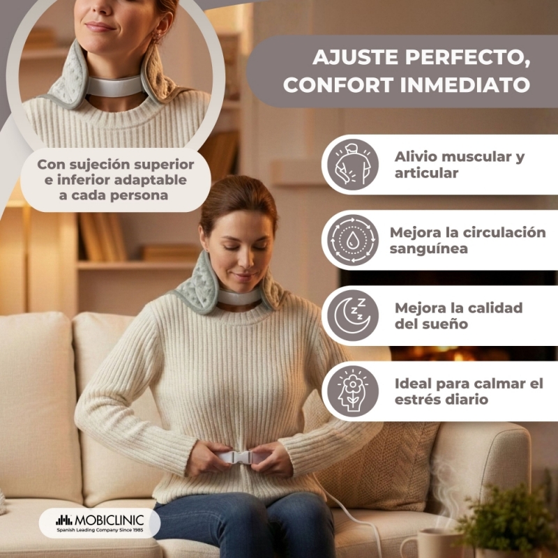 La almohadilla se ajuste muy bien. Se calienta reepido, al encenderlo utilizo la potencia 3 y cuando ya estee caliente la bajo al 1. No le pongo 5 estrellas por que esperaba que el calor se distribuyera tambieen por la zona que rodea el cuello.