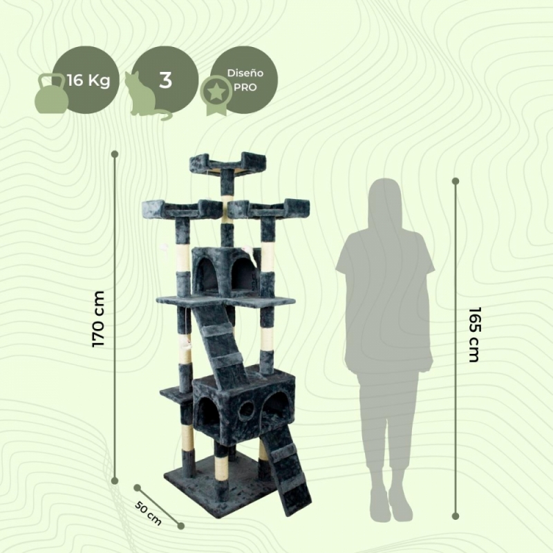 - Tres columnas elevadas: Las columnas perfeccionan el diseño y añaden a la estructura cuerda de sisal para que tu gato juegue y se desestrese con ellas.