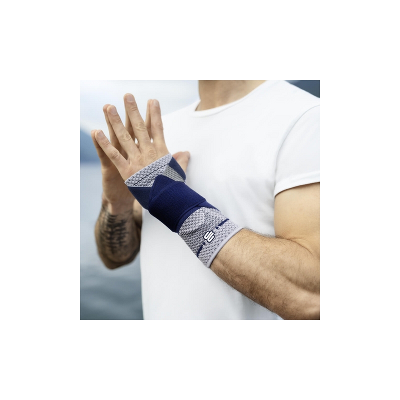 El sistema de correas de esta muñequera ortopédica en dos niveles permite ajustar individualmente la estabilización según su dolencia sin restringir sus movimientos de agarre. El sistema de correas se envuelve desde el antebrazo alrededor de la palma de la mano y la muñeca y se fija allí para proporcionar un alivio inmediato y notable del dolor intenso. A partir de ahí, el grado de estabilización puede reducirse según el tratamiento y la intensidad del dolor, prescindiendo primero de la cinta de estabilización al llevar el vendaje y, después, de la banda elástica de la fascia, que se tensa envolviendo la muñeca.