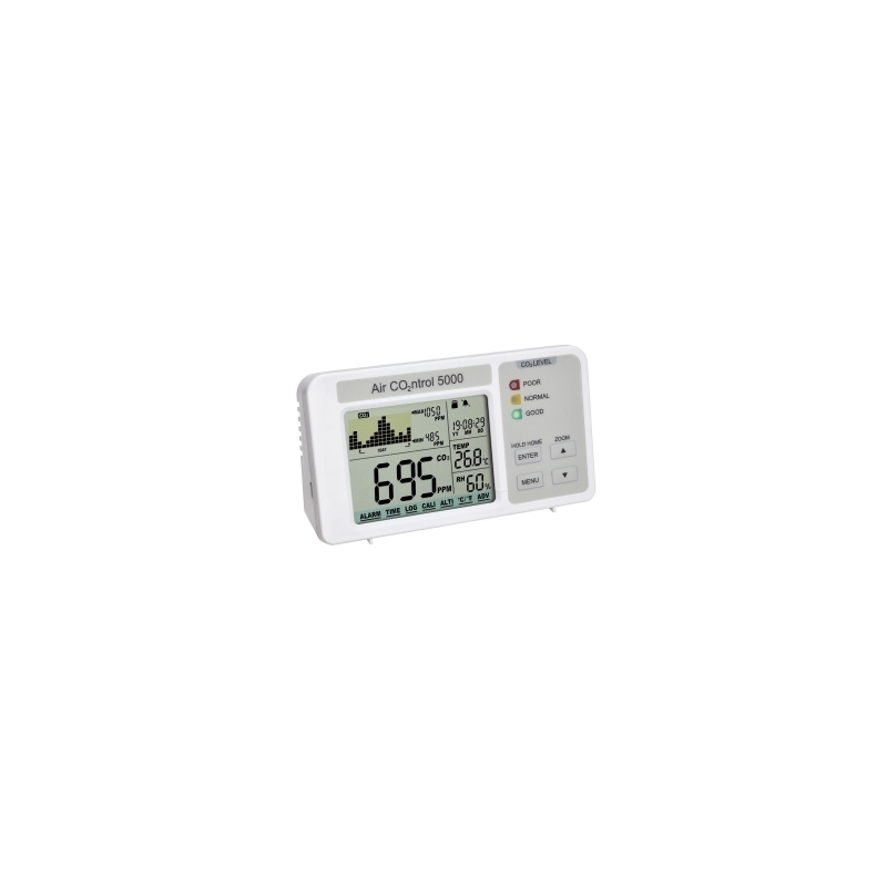 Además del contenido de CO2, el dispositivo mide la temperatura y la humedad del ambiente y le informa de la fecha y la hora. La pantalla muestra el contenido actual de CO2, así como un gráfico con los valores pasados y los correspondientes valores máximos y mínimos. El eje de tiempo del gráfico de barras puede ajustarse de forma variable a un minuto, una hora, un día o una semana. Opcionalmente, los últimos valores de temperatura y humedad medidos también pueden mostrarse claramente en el gráfico.