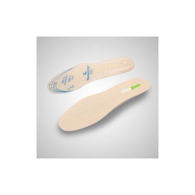 La plantilla de silicona y gel está diseñada con con gel de grado médico y esencia de aloe vera. Su diseño permite la transpirabilidad del gel y facilita el flujo de aire con cada pisada evitando el efecto ventosa. Perfil bajo. Forrada de tejido técnico con de efecto permanente: antibacterias, 100% transpirable, absorbente, antiolor, antiácaros y termorregulador. Para todo tipo de pieles