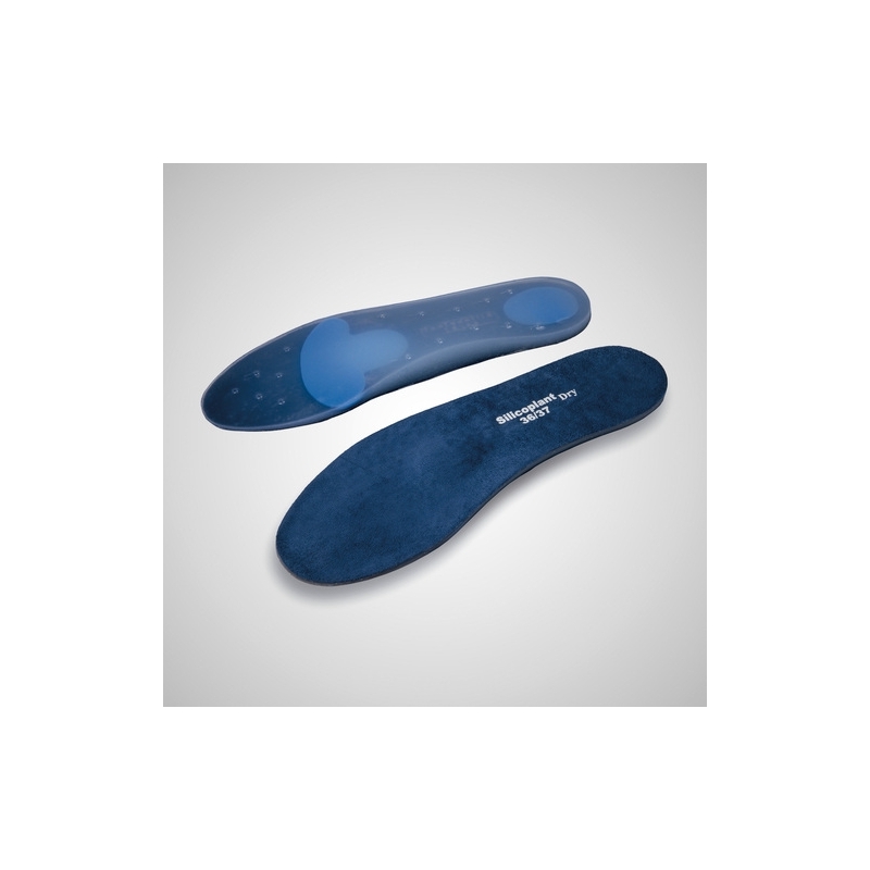 Plantilla forrada de un tejido especial para mejorar la transpiración, produciendo bienestar en personas con excesiva sudoración. Con arco longitudinal interno y apoyo retrocapital central. Con almohadillas de silicona de menor densidad en las cabezas metatarsales y en el talón. De silicona médica viscoelástica que mantenien una distribución homogénea de las presiones en la planta del pie. Amortiguan el impacto del pie, aportando una sensación de confort y relajación.
