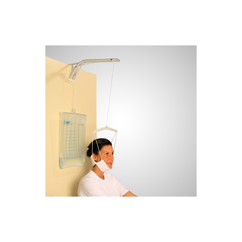 Sistema sencillo en montaje y utilización para conseguir una tracción cervical efectiva del paciente en una puerta o en la pared. Un sistema de poleas nos permite regular el ángulo de tracción mientras que el llenado de la bolsa nos permite regular el peso o fuerza de tracción.