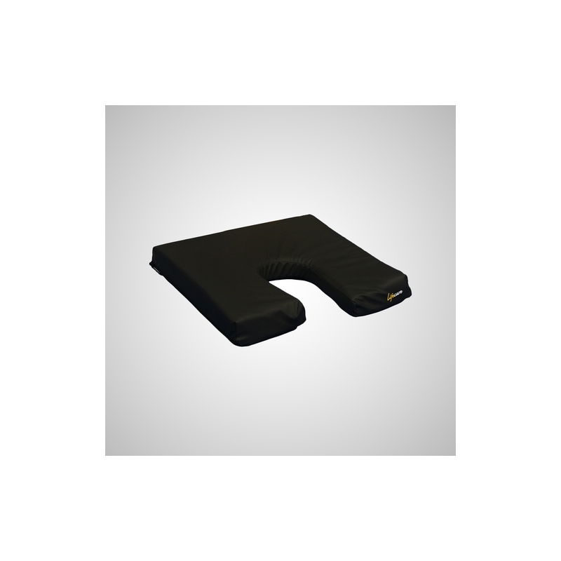Cojín antiescara estetico, confortable, resistente y fiable con funda exterior lavable, antideslizante y con cierta resistencia al fuego. No desliza sobre el asiento. Se adapta con facilidad a las sillas de ruedas del mercado. Envasado en caja con asa para facilitar su transporte y almacenamiento. Perfil herradura. Está compuesto de material viscoelástico con memoria. Posee una elegante funda exterior negra, hidrófoba, antideslizante e ignífuga: retardante de llama, y transpirable.1, con apertura sencilla tipo cremallera en U y asa para facilitar su manejo. Extremadamente ligero y fácil de limpiar. Confortabilidad personalizada para cada usuario. Uso recomendable hasta 100Kg.
