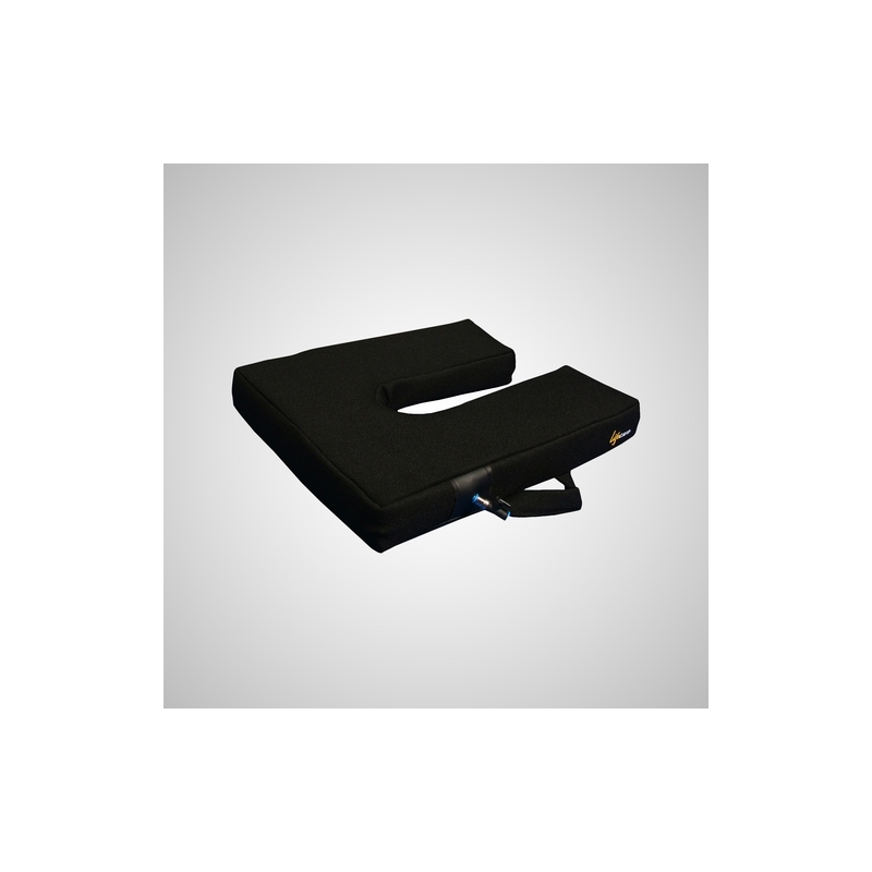 Cojín antiescara estetico, confortable, resistente y fiable con funda exterior lavable, antideslizante y con cierta resistencia al fuego. No desliza sobre el asiento. Se adapta con facilidad a las sillas de ruedas del mercado. Envasado en caja con asa para facilitar su transporte y almacenamiento. Perfil de herradura. Está compuesto de un sistema de aire graduable mediante una válvula de cierre y con una base de espuma o foam. Sistema de válvula para regulación del aire interior: adapta el cojín según el peso y características del paciente. Basado en el "principio de flotación". Con funda exterior lavable, antideslizante e ignífuga M1, con apertura sencilla tipo velcro y asa para facilitar su manejo. Extremadamente ligero. Confortabilidad personalizada para cada usuario. Uso recomendable hasta 100Kg.