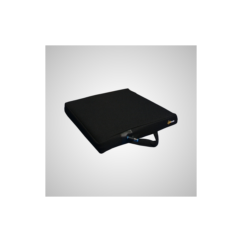 Cojín antiescara estetico, confortable, resistente y fiable con funda exterior lavable, antideslizante y con cierta resistencia al fuego. No desliza sobre el asiento. Se adapta con facilidad a las sillas de ruedas del mercado. Envasado en caja con asa para facilitar su transporte y almacenamiento. Perfil cuadrado. Está compuesto de un sistema de aire graduable mediante una válvula de cierre y con una base de espuma o foam. Sistema de válvula para regulación del aire interior: adapta el cojín según el peso y características del paciente. Basado en el "principio de flotación". Con funda exterior lavable, antideslizante e ignífuga M1, con apertura sencilla tipo velcro y asa para facilitar su manejo. Extremadamente ligero. Confortabilidad personalizada para cada usuario. Uso recomendable hasta 100Kg.