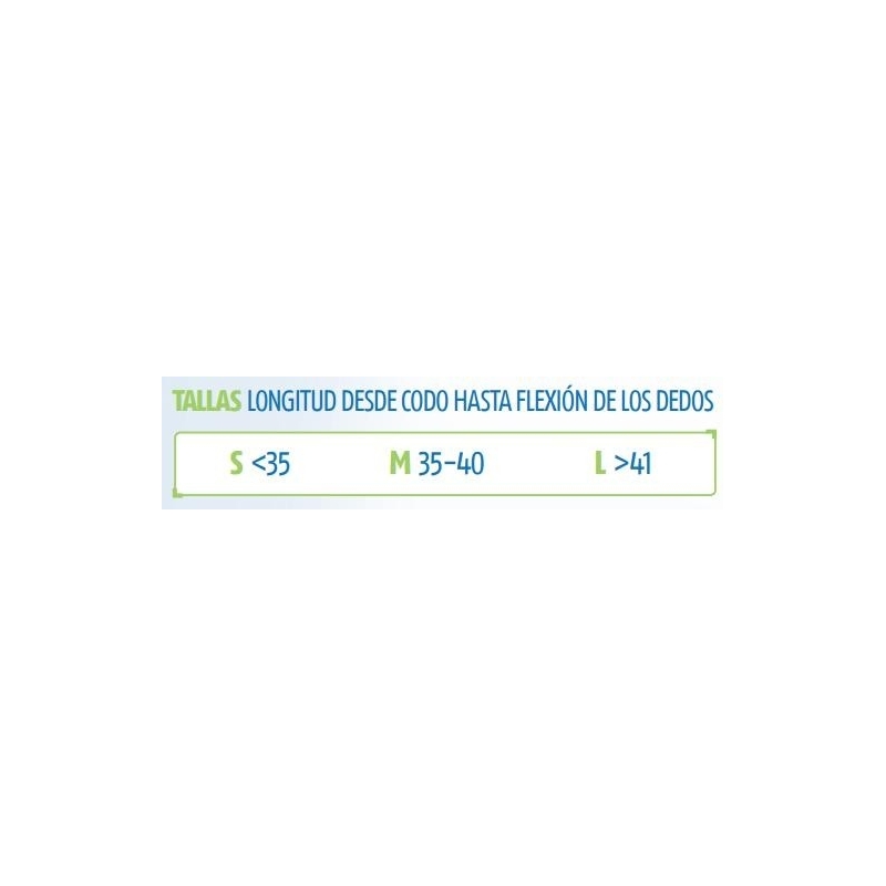 La talla se mide según la longitud desde el codo hasta la flexión de los dedos. Tallas disponibles: S, M, L.