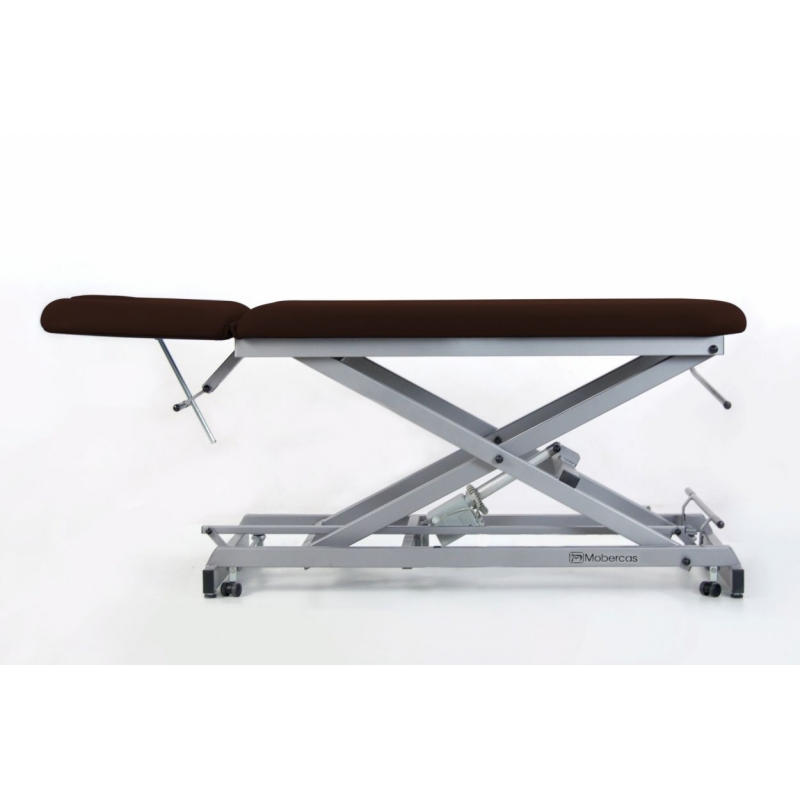 Camilla de reconocimiento eléctrica de 2 secciones con respaldo reclinable en negativo y subida recta sin desplazamiento lateral, portarrollos, tapón facial y ruedas escamoteables.