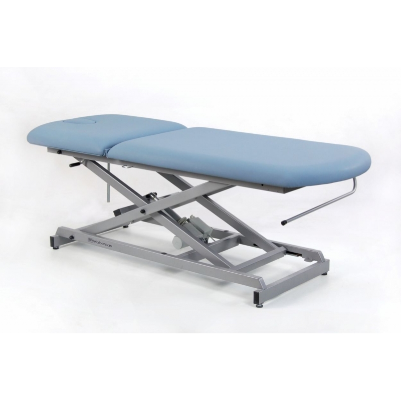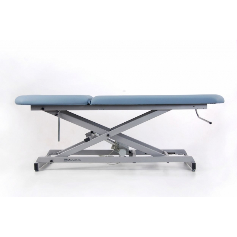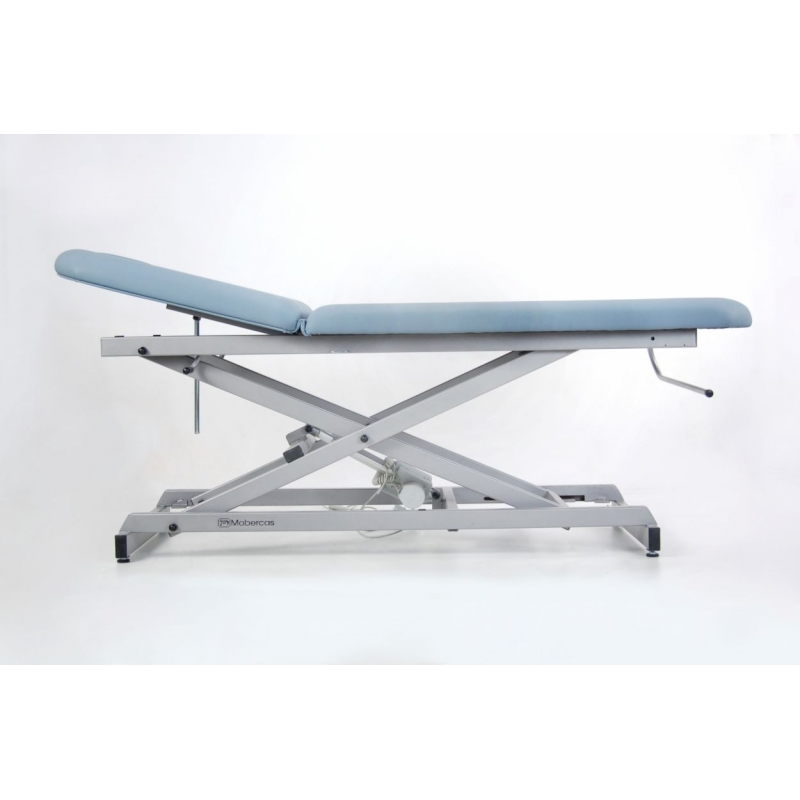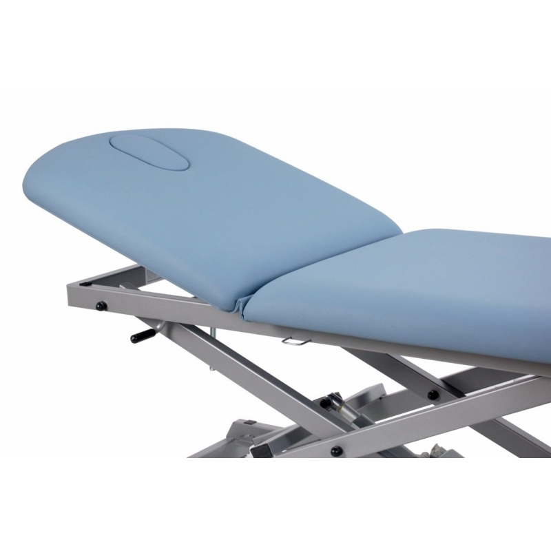 Camilla de reconocimiento eléctrica de 2 secciones, con subida recta sin desplazamiento lateral, portarrollos y tapón facial.