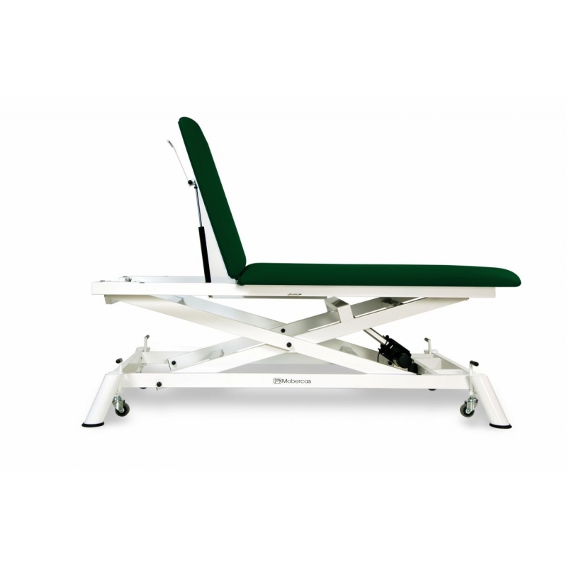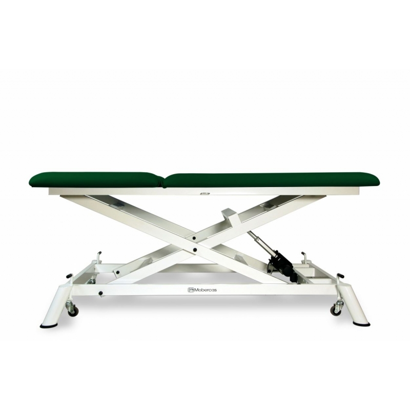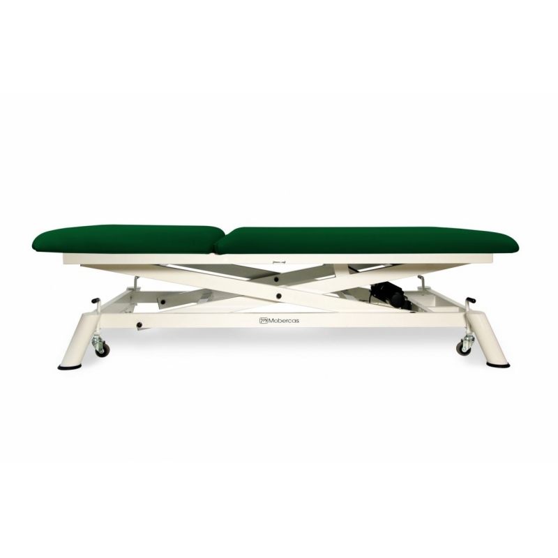 Camilla eléctrica Bobath tipo tijera con subida recta sin desplazamiento lateral, de 2 secciones y con ruedas escamoteables. Medidas de 190x100.