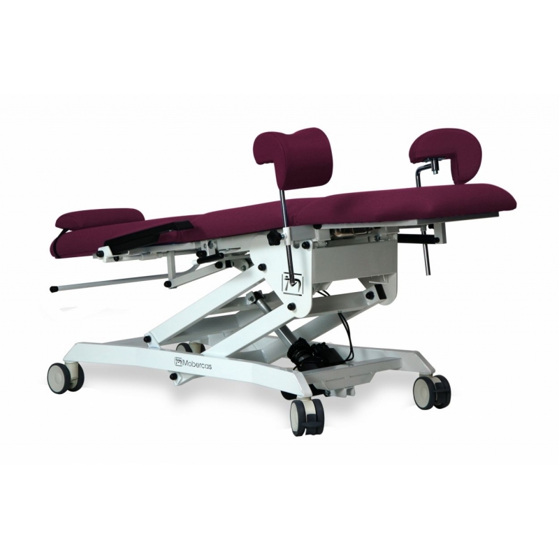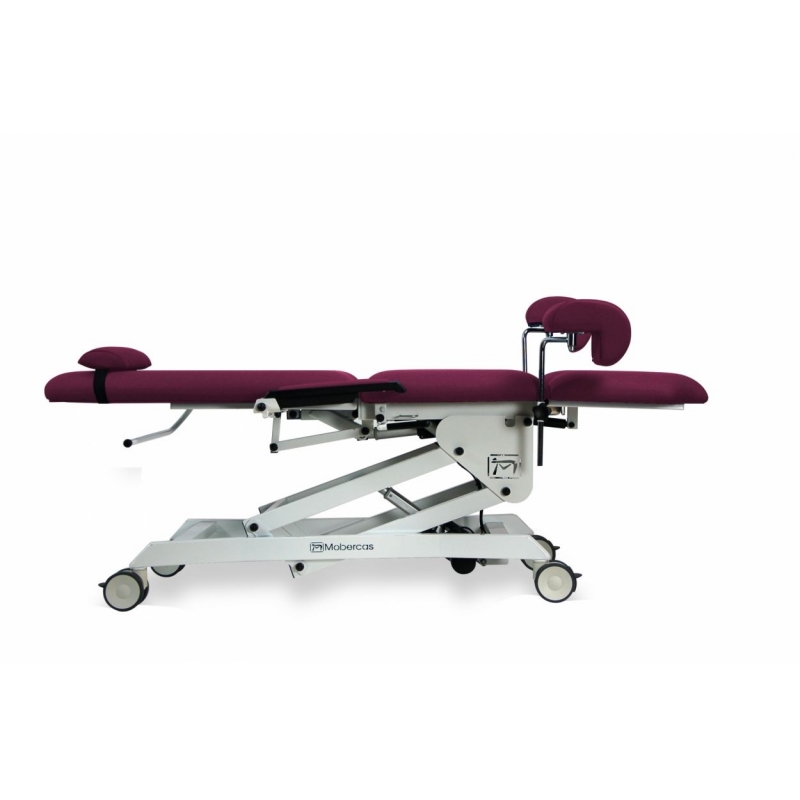 Sillón de reconocimiento ginecológico eléctrico con 3 motores para la regulación de altura, respaldo y Trendelenburg/antitren mediante mando de mano. Incluye perneras ginecológicas, bandeja extraíble en acero inoxidable, apoyabrazos abatibles para facilitar el acceso lateral, cojín cervical ergonómico y portarrollos.