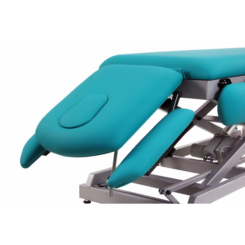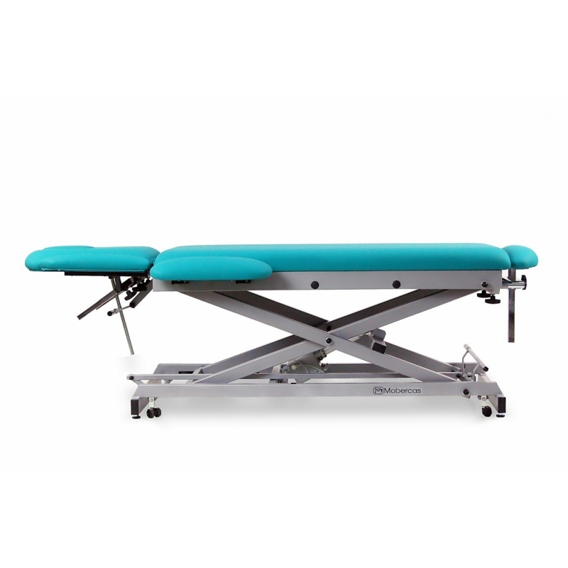 Camilla eléctrica multifuncional para osteopatía de 7 secciones con subida recta sin desplazamiento lateral, tapón facial y ruedas escamoteables. Respaldo reclinable en negativo con brazos, brazos laterales y apoya-pies regulable y extraíble.