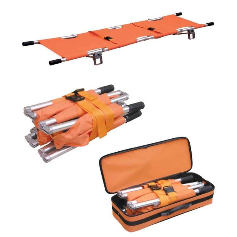 Camilla de cuatro plegados fabricada en aleación de aluminio y materiales de cuero impermeables. Muy ligera y de tamaño reducido. Dos cinturones de apertura rápida garantizan que el proceso de transporte sea seguro.