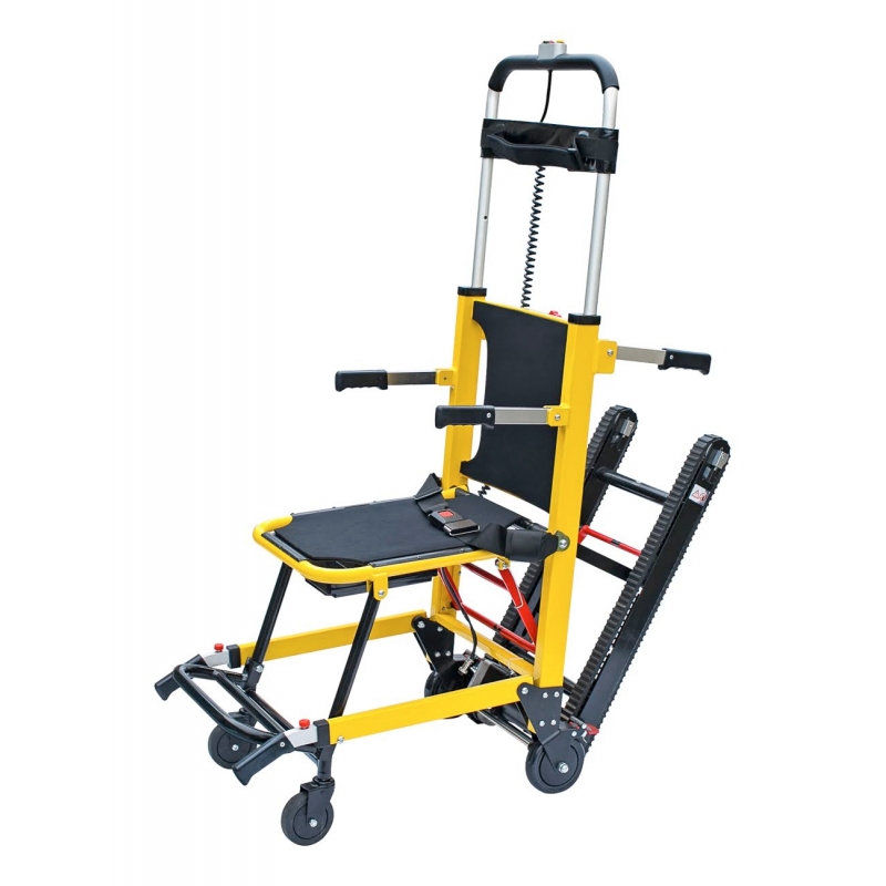 Silla de evacuación para escaleras fabricada en aleación de aluminio de alta resistencia. Dos cinturones para garantizar la seguridad de los pacientes durante el transporte. Operable por una sola persona. Cuatro ruedas para facilitar el manejo