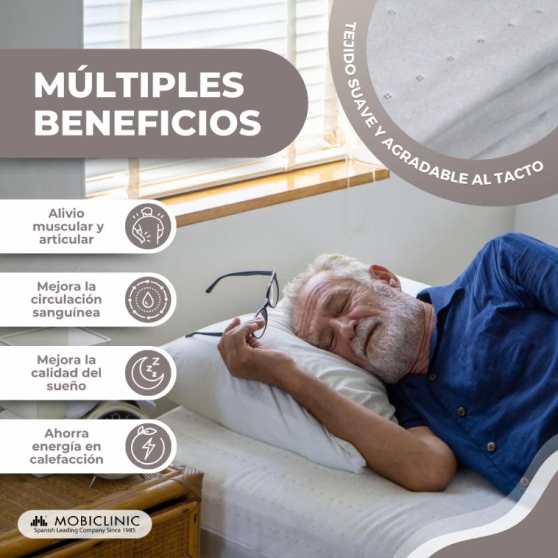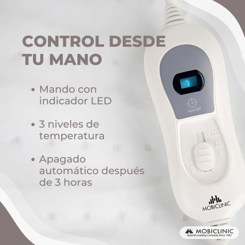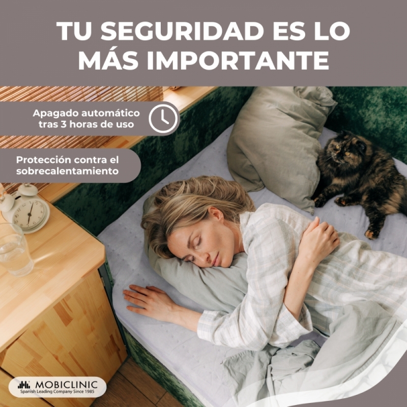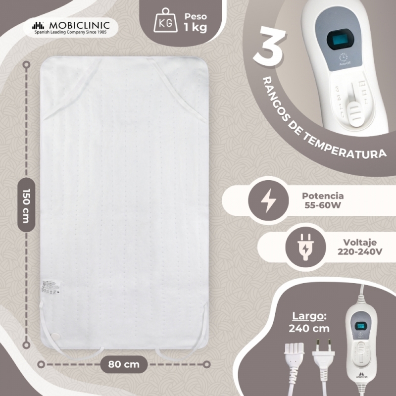 Calientacamas individual|Eléctrico|3 niveles temperatura|Muy bajo consumo|Apagado automático|Lavable|Blanco|Mobiclinic