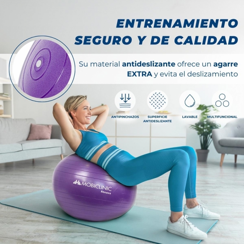 Esta pelota de pilates es antideslizante, pues su superficie cuenta con unas líneas horizontales que garantizan un agarre seguro que evita que el usuario se resbale, dándole la oportunidad de realizar cualquier tipo de ejercicio de equilibrio.
