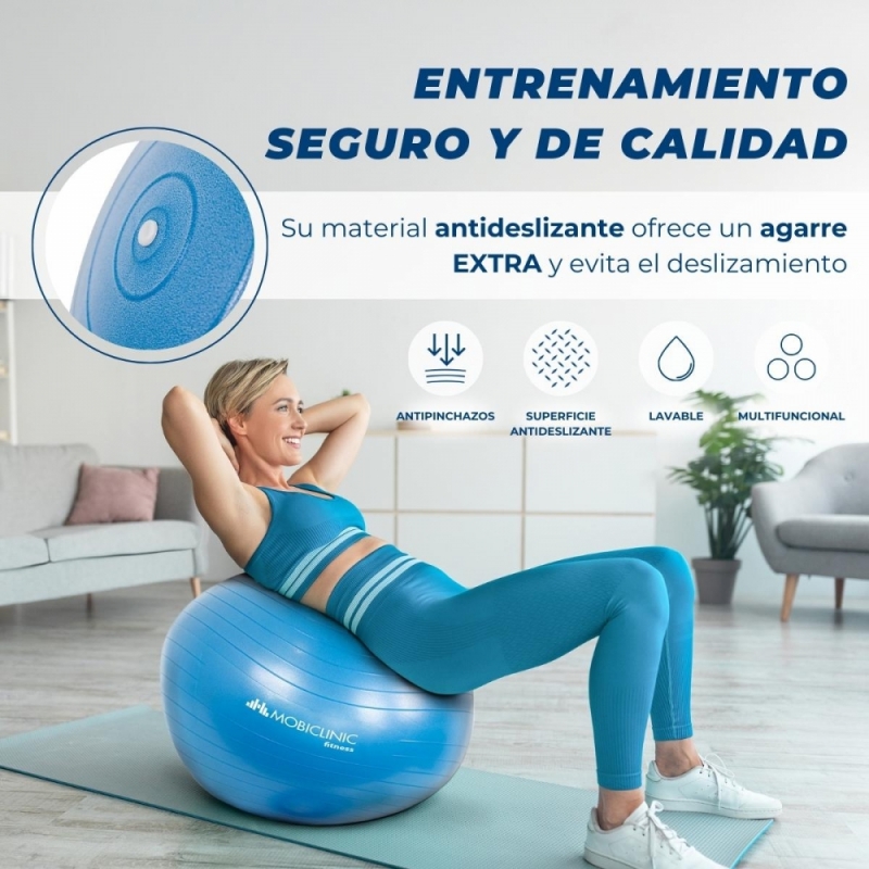 Esta pelota de pilates es antideslizante, pues su superficie cuenta con unas líneas horizontales que garantizan un agarre seguro que evita que el usuario se resbale, dándole la oportunidad de realizar cualquier tipo de ejercicio de equilibrio.